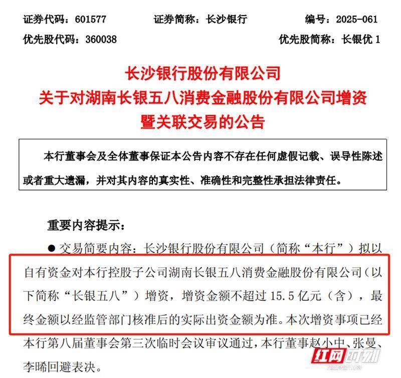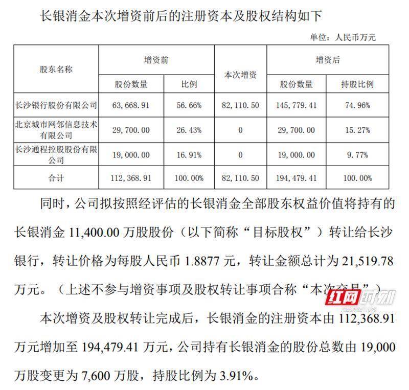 长沙银行公告信息。红网时刻新闻12月17日讯(记者 肖娟)湖南首家消费金融公司或迎来第三次增资。12月16日,长沙银行发布公告,拟以自有资金对控股子公司湖南长银五八消费金融股份有限公司(简称“长银五八”)增资,增资金额不超过15.5亿元(含),每股增资价格为1.8877元。本次增资后,长银五八的注册资本由11.24亿元增加至19.45亿元,长沙银行持股比例将从56.66%提升至74.96%。长沙银行公告表示,本次增资能进一步充实长银五八资本,增强其风险抵御能力,为其持续稳健经营创造条件。同日发布的通程控股公告显示,长银五八另两家发起股东通程控股及北京城市网邻信息技术有限公司(简称“北京网邻”)不参与此次增资。