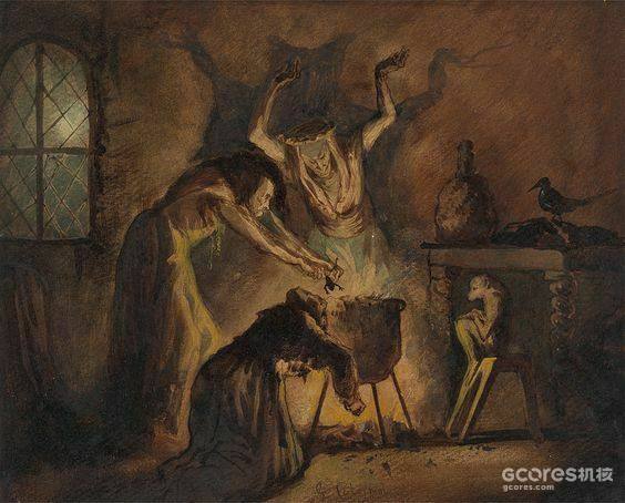 第一个女巫:我来了,灰马尔金! 第二个女巫:来吧帕多克。这里的灰马尔金是灰猫使魔,而帕多克就是蟾蜍使魔。