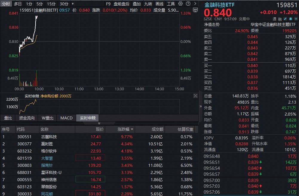 26日早盘,大盘八连阳冲击4000点之际,金融科技明显异动拉升。其中,古鳌科技领涨超7%,赢时胜、格尔软件、大智慧等涨超4%,指南针、神州信息、同花顺等多股涨超2%。热门ETF方面,同类规模最大、流动性最佳的金融科技ETF(159851)场内快速上扬逾1%,冲击三连阳,资金实时净申购2000万份。