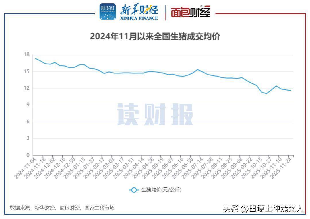 根据国家生猪市场披露的数据,全国生猪成交均价进入2025年以来稳中波动向下,期间最高价为16.23元/公斤,最低价为11.05元/公斤。2025年11月,生猪成交均价较去年同期跌幅超过20%。