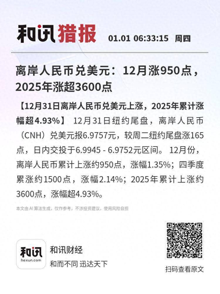 【12月31日离岸人民币兑美元上涨,2025年累计涨幅超4.93%】12月31日纽约尾盘,离岸人民币(CNH)兑美元报6.9757元,较周二纽约尾盘涨165点,日内交投于6.9945 - 6.9752元区间。 12月份,离岸人民币累计上涨约950点,涨幅1.35%;四季度累涨约1500点,涨幅2.14%;2025年累计上涨约3600点,涨幅超4.93%。