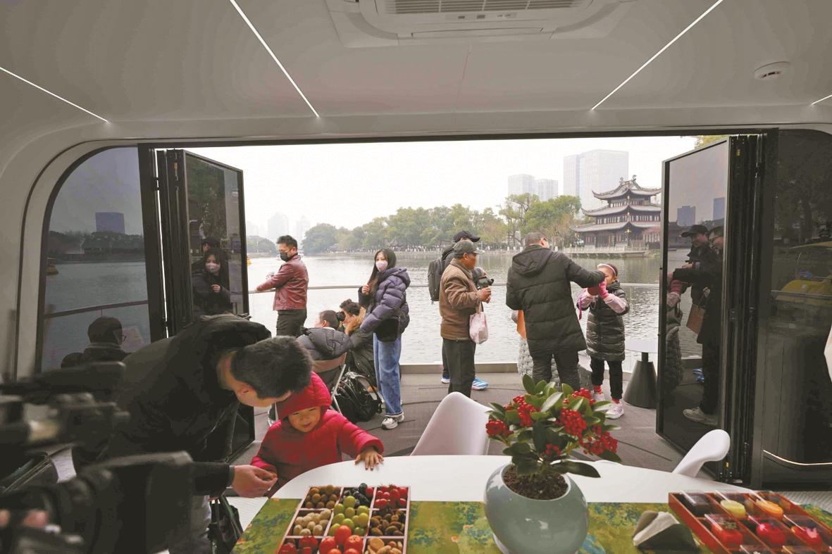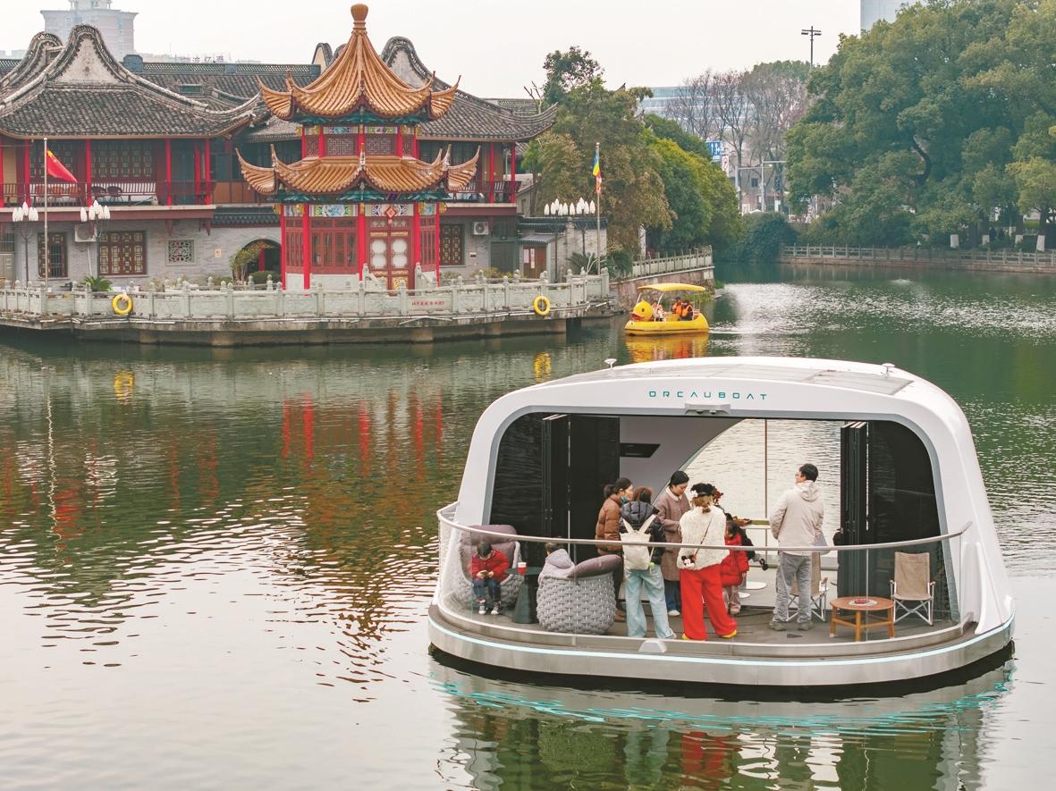 “我经常逛月湖,坐过画舫,也踩过‘小黄鸭’,但这次智能游船体验非常特别,不仅舱内容纳的人数更多了,还能享受自动驾驶、AI讲解等服务。”有市民朋友由衷感慨道。