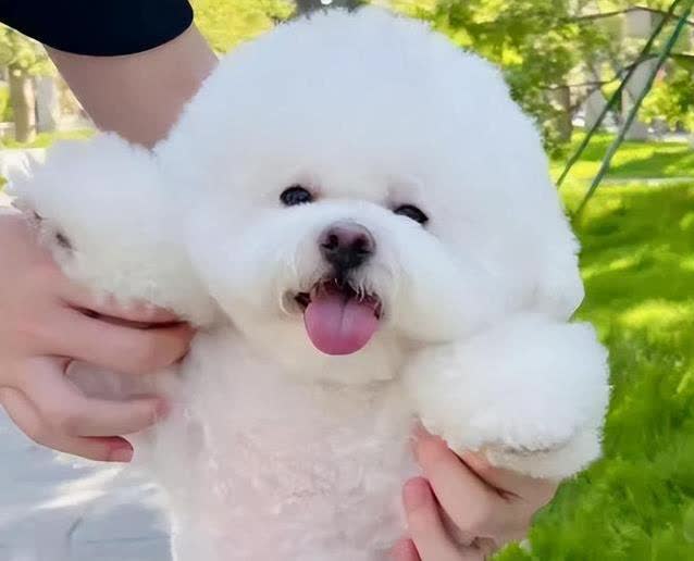 比熊犬的脸长得特别招人疼。圆圆的脑袋,大大的黑眼睛,像两颗闪亮的黑葡萄,总是带着点好奇的神情。它们的耳朵藏在毛里,耷拉着,显得特别温顺。尾巴呢?毛茸茸的,卷在背上,走路的时候一甩一甩,活像在跟你打招呼。