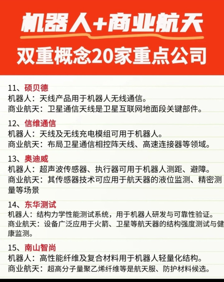 通信与材料领域的企业则在双赛道中展现出场景适配性。硕贝德、信维通信的天线产品,既服务于机器人无线通信,又成为卫星互联网地面段的关键部件;奥迪威的超声波传感器可实现机器人测距避障,也能用于航天器液位监测;南山智尚的高性能复合材料助力机器人轻量化,其超高分子量聚乙烯纤维还可作为航天服防护材料;中研股份的PEEK特种工程塑料,既制造耐磨机器人齿轮,也广泛应用于航天器部件,材料技术的通用性成为企业跨赛道发展的核心优势。