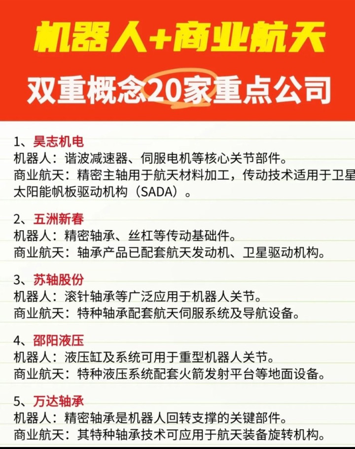 机器人与商业航天的技术融合,首先体现在核心零部件领域。昊志机电的谐波减速器、伺服电机是机器人关节核心部件,其精密主轴技术又可用于航天材料加工与卫星太阳能帆板驱动;五洲新春的精密轴承、丝杠既支撑机器人传动系统,又配套航天发动机与卫星驱动机构。苏轴股份的滚针轴承、万达轴承的精密回转支撑轴承,分别在机器人关节与航天装备旋转机构中实现技术复用,邵阳液压的特种液压缸则兼顾重型机器人关节与火箭发射平台液压系统需求,成为硬科技赛道的“零部件基石”。