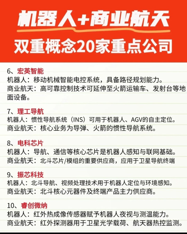 在科技赛道的双线发力下,机器人与商业航天成为A股市场的核心主线,二者凭借精密制造、特种材料、智能控制等技术同源性,催生出一批兼具双重概念的优质标的。本文梳理20家同时布局两大赛道的上市公司,拆解其业务布局与核心竞争力,把握科技融合下的投资机遇。
